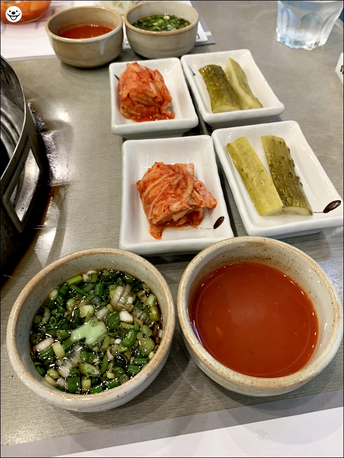 두 개의 소스류와 김치 그리고 오이절임을 주십니다.