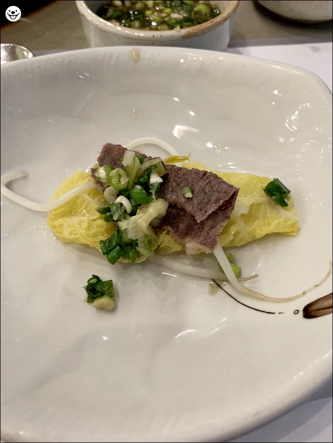 잘 익은 소고기를 소스에 담가서 한입 먹어봅니다.