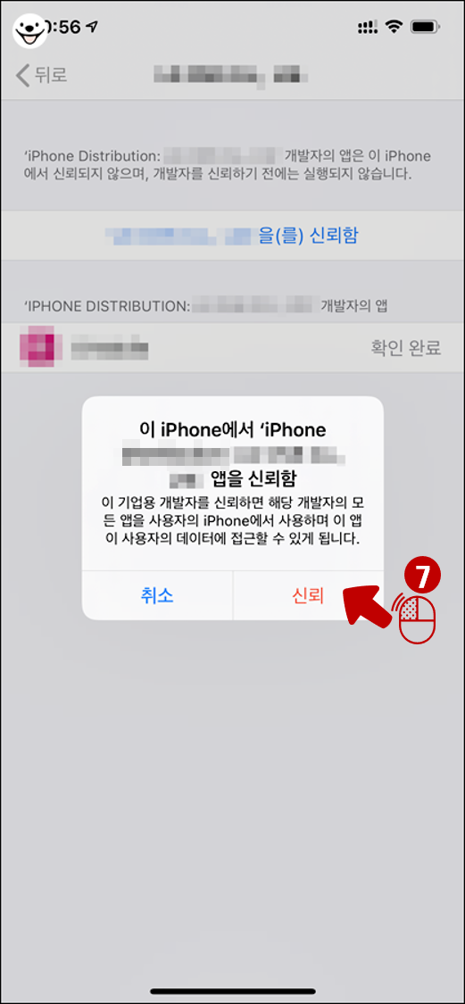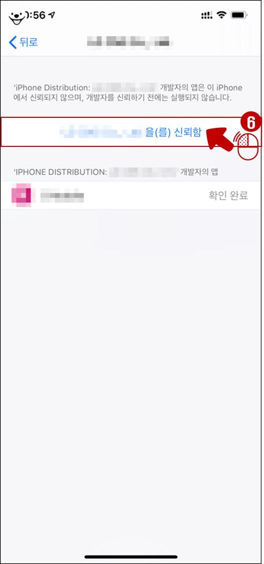 7.앱을 신뢰함 이란 메시지에서 '신뢰'를 다시한번 탭합니다.