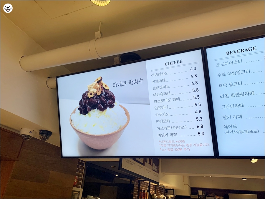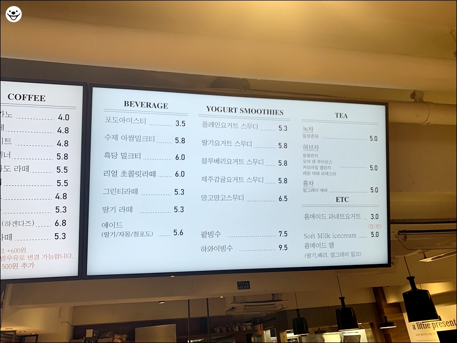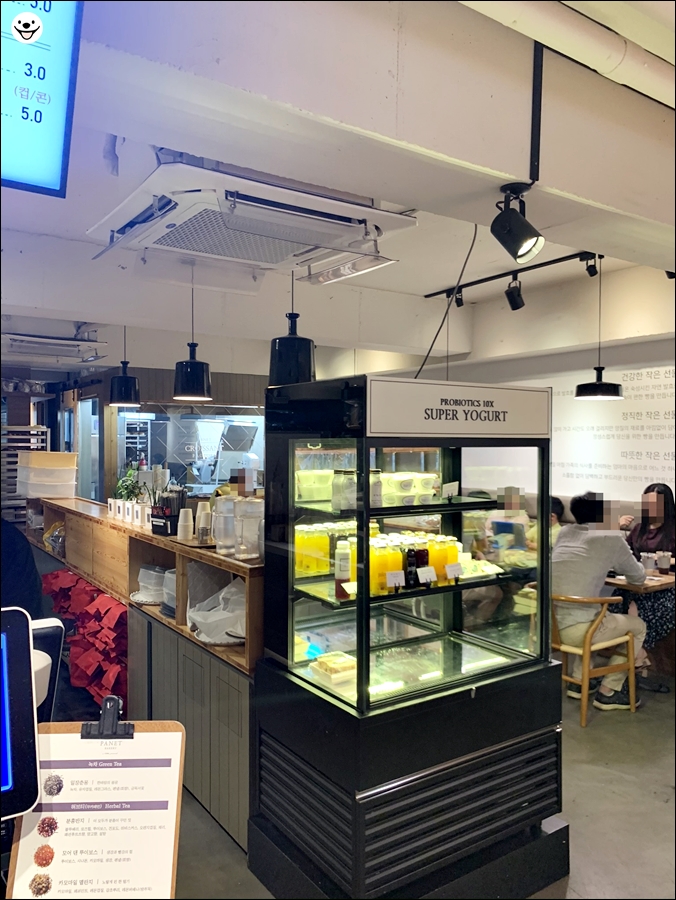 뒤쪽에는 요거트와 과일주스가 있고 옆에는 8개 정도의 테이블이 있습니다.