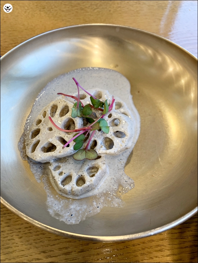 살짝 익힌 연근에 고소한 들깨 가루 소스인 것 같습니다. 정확히는...