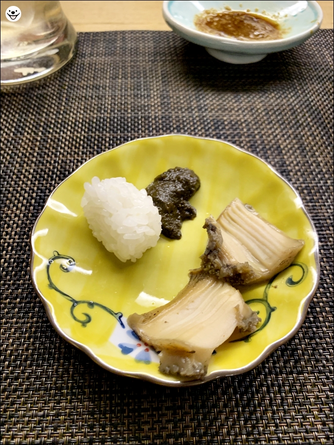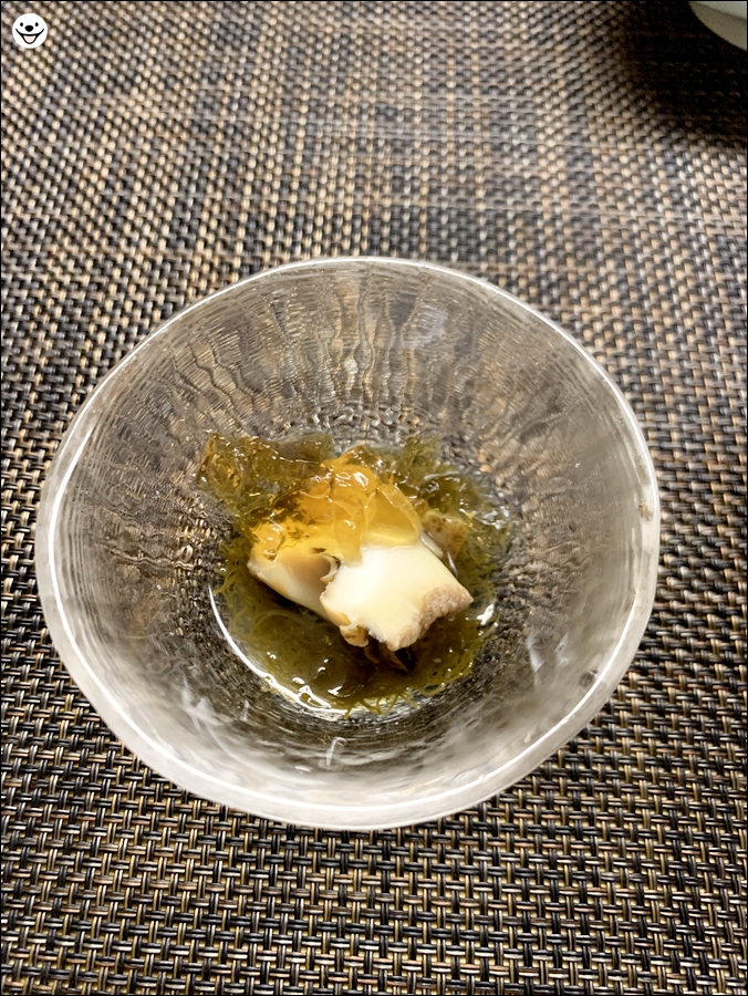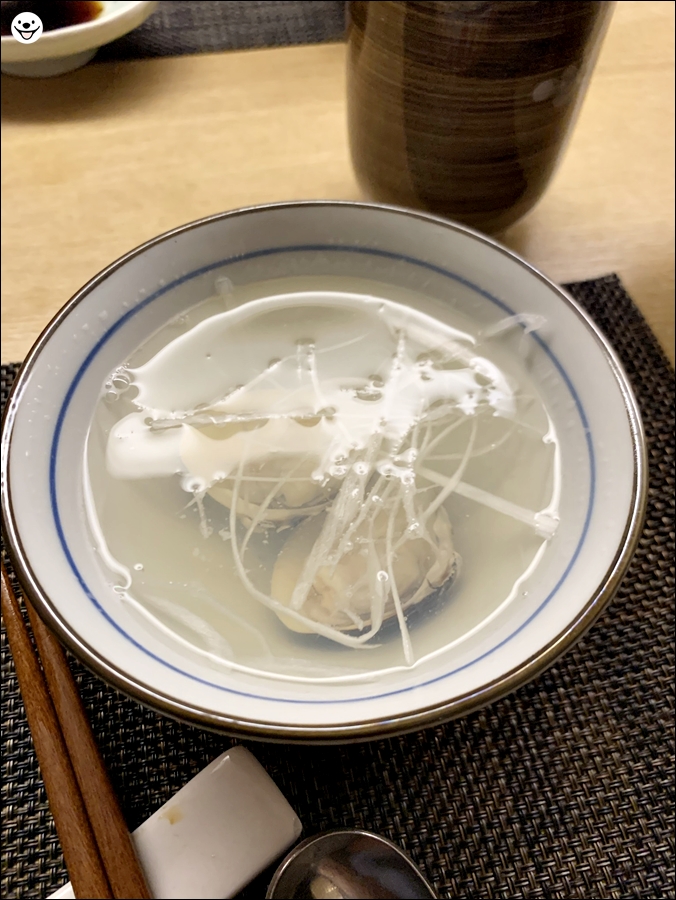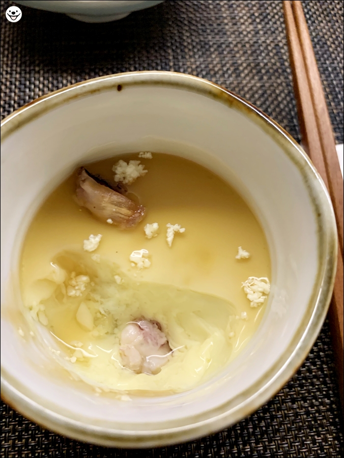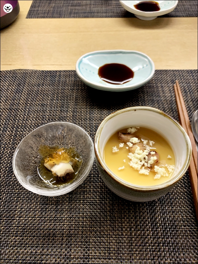 왼쪽은 소라와 간장 소스가 오른쪽은 일본식 계란찜 차완무시입니다.