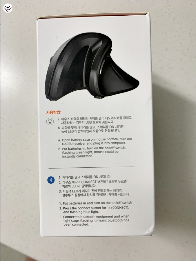 박스를 오픈하면 마우스와 오른쪽 끝에 건전지를 같이 동봉되어 있습니다.