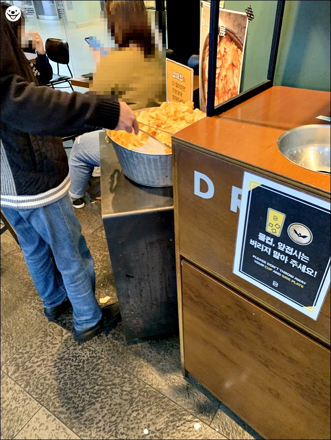 버거를 기다리는 동안 직접 튀긴 감튀를 자유롭게 먹을 수 있습니다.