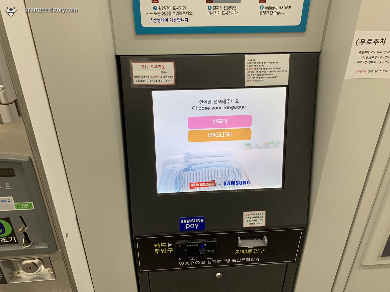 그리고 적립기에서 결제 후 세탁기에서 코스를 선택하고 시작 버튼을 누르면 세탁기가 알아서 돌아가기 시작합니다.