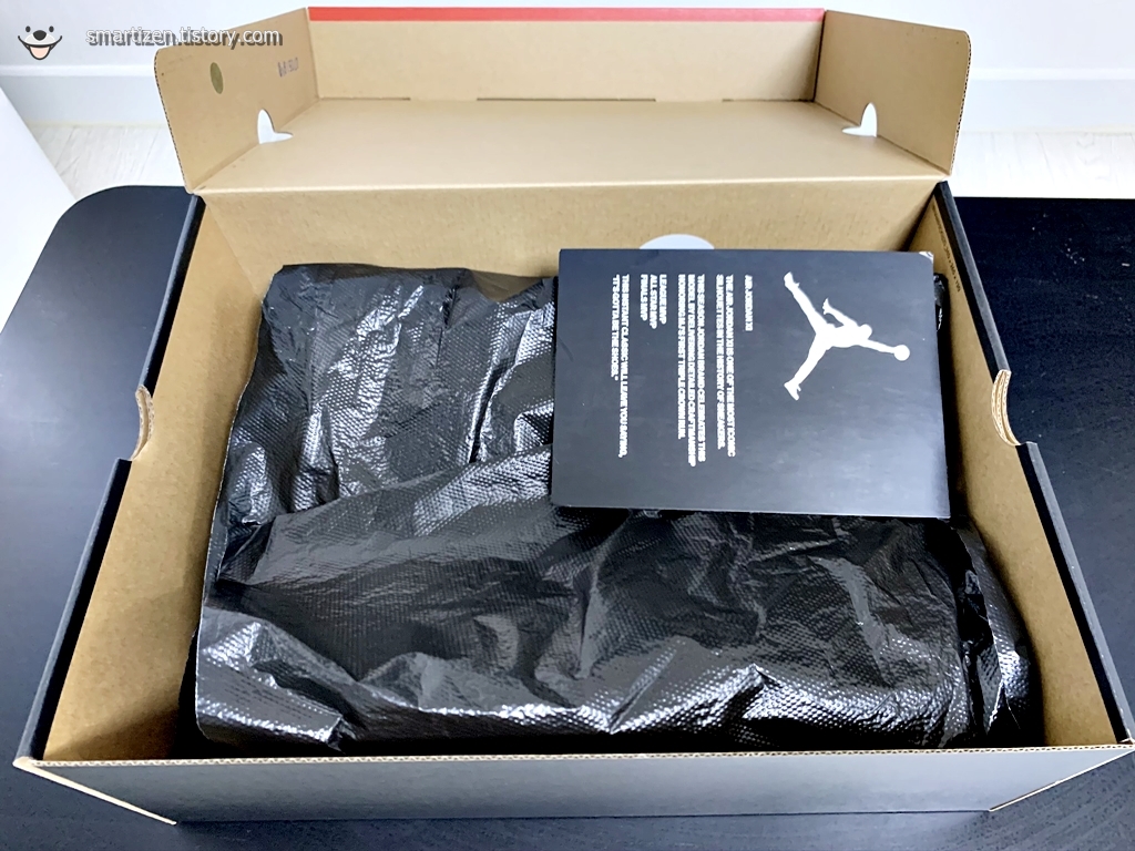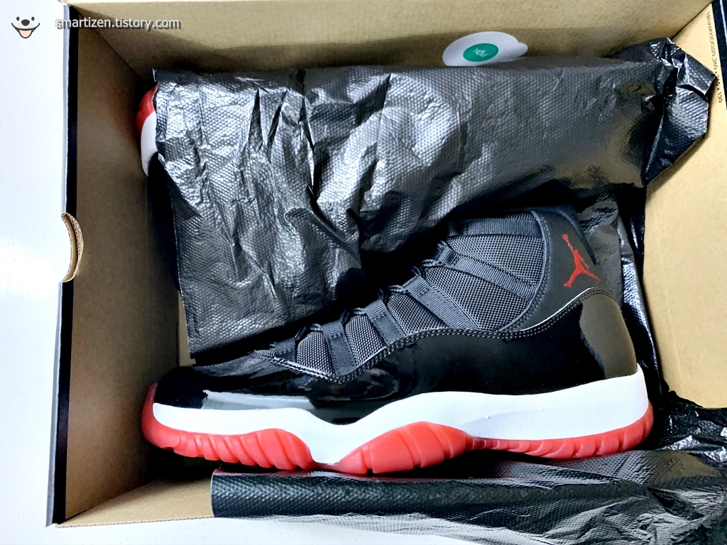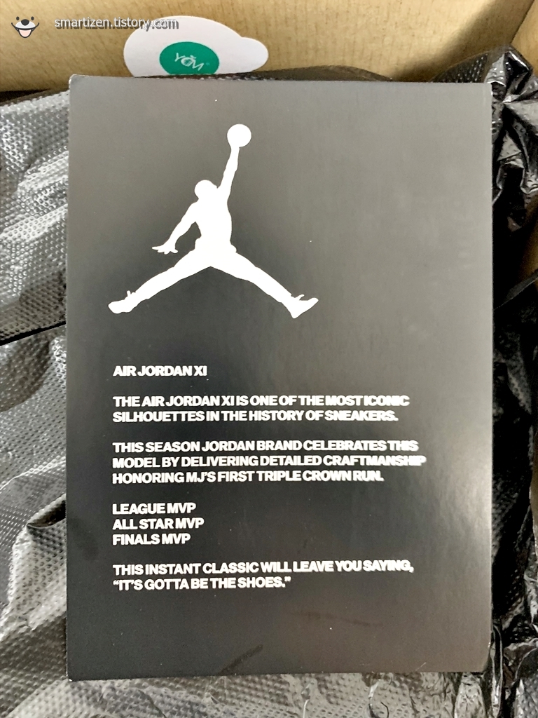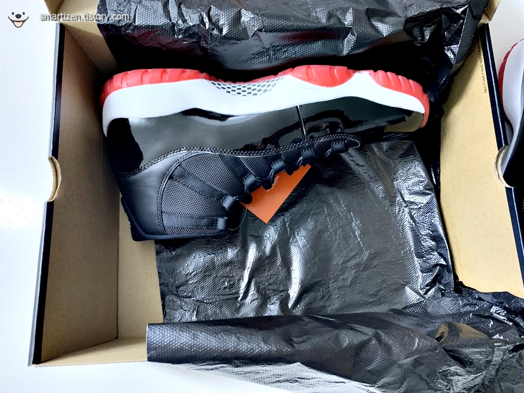 나이키의 다른 신발들은 대부분 기름종이로 포장되어 있는데 조던 11 레트로는 검정 비닐 재질입니다.