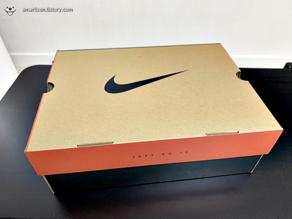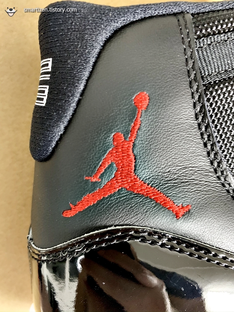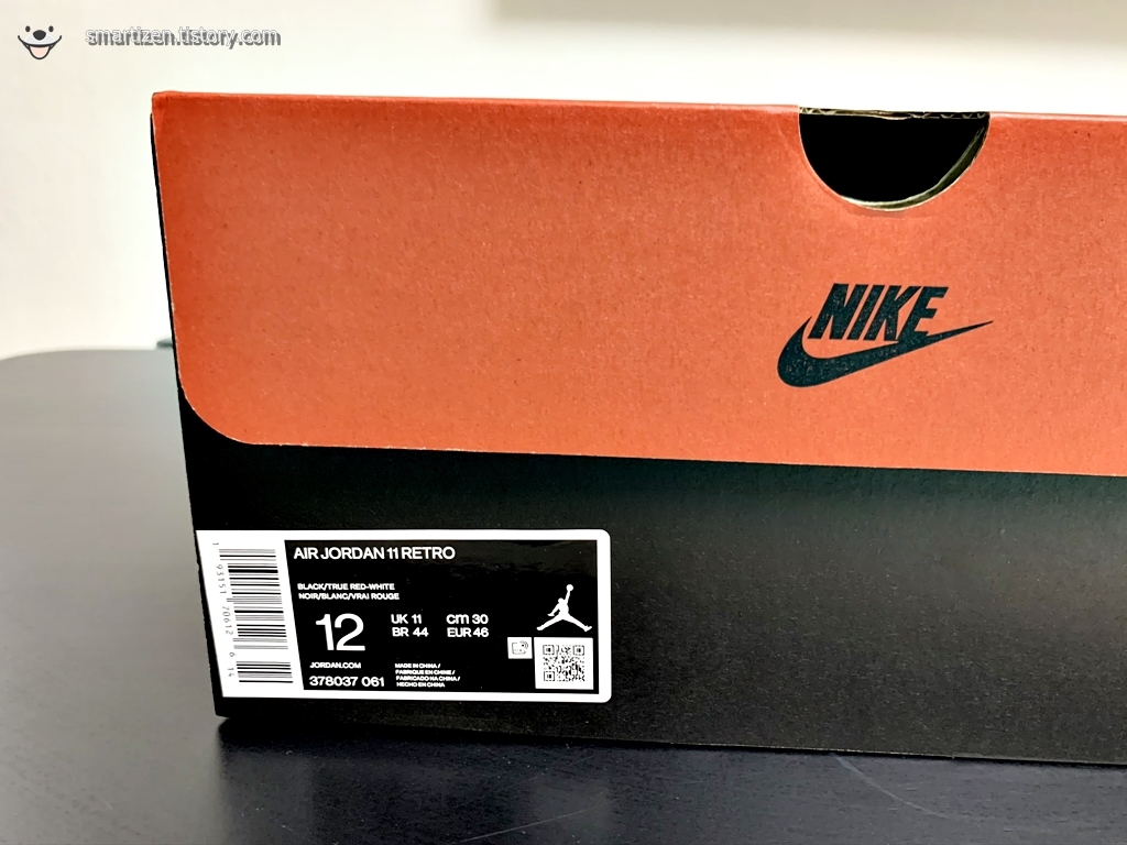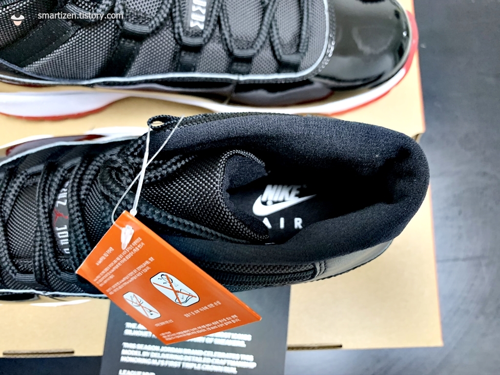 나이키의 다른 신발들은 대부분 기름종이로 포장되어 있는데 조던 11 레트로는 검정 비닐 재질입니다.