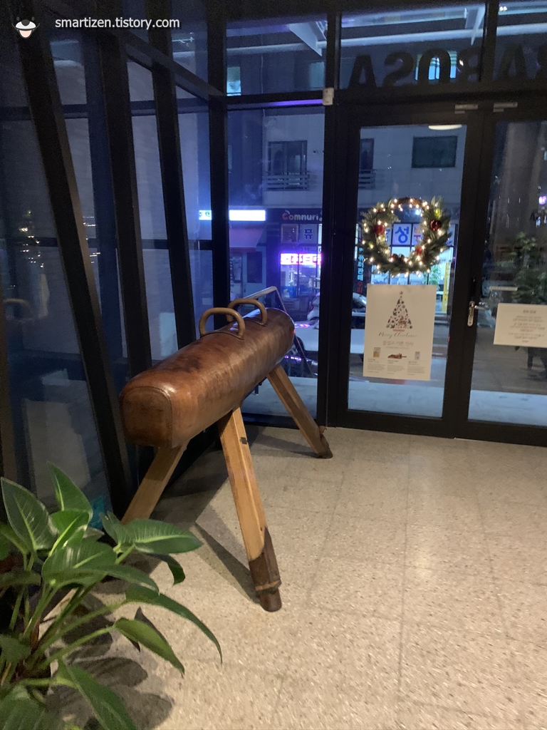 모퉁이를 돌면 몇 개의 테이블과 또 안마 기구가 있습니다.