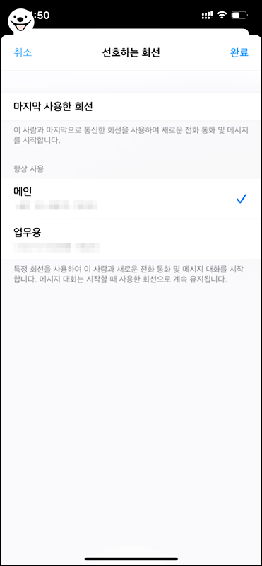 최근 통화 목록에도 메인 회선과 보조 회선이 분리되어 확인할 수 있습니다.