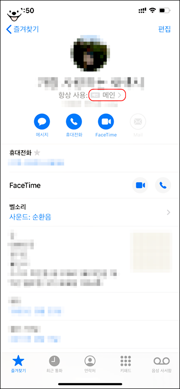 '전화 > 즐겨찾기 > 즐겨찾기한 번호의 ⓘ 표 선택 > 항상 사용 회선'을 변경