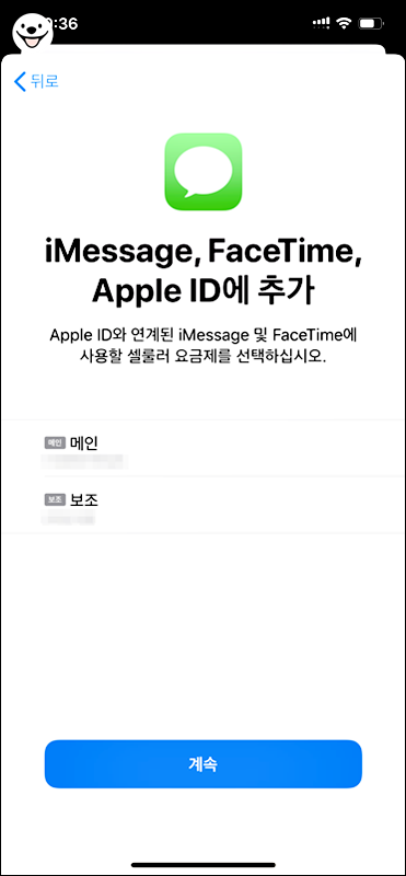 6. iMessage, FaceTime Apple ID에 추가는 '메인'을 선택하고 '계속'을 누릅니다.