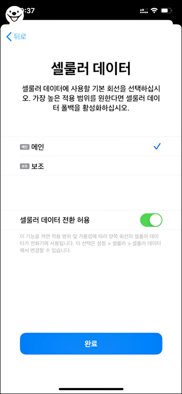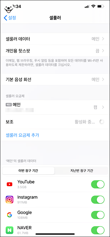 2. '설정 > 셀룰러'에 보조 요금제가 활성화되고 있습니다.