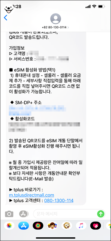 eSIM 최종 설정이 완료되면 문자 한 통이 옵니다.