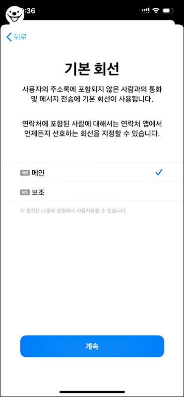 5. 기본 회선에서는 '메인'을 선택하고 '계속'을 누릅니다.