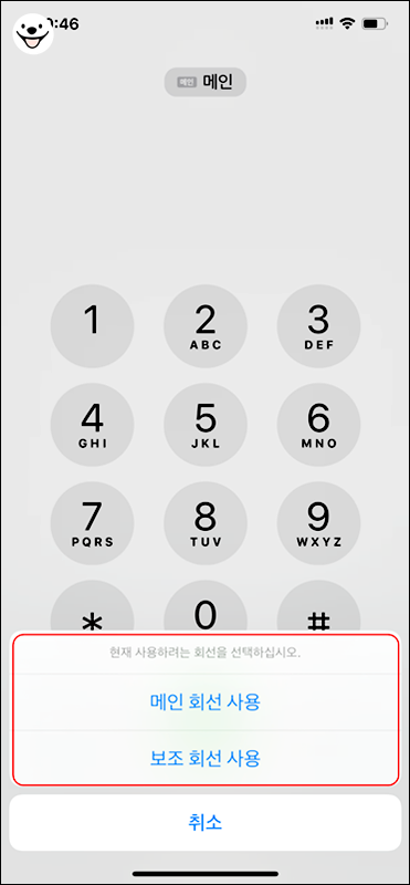 버튼을 누르면 하단에 메인 회선과 보조 회선 중 사용할 회선을 선택하라는 알림이 나옵니다.