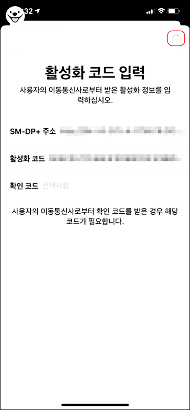 QR 코드와 함께 SM-DP+ 주소와 활성화 코드가 문자에 포함되어 있습니다.